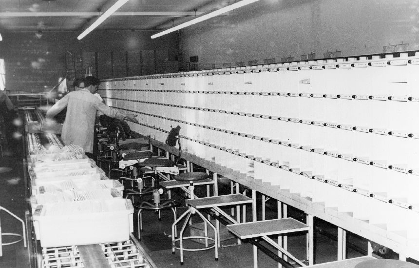 Titel: Oslo Sentrum, postkontor. Avgående brevsortering, 1965.