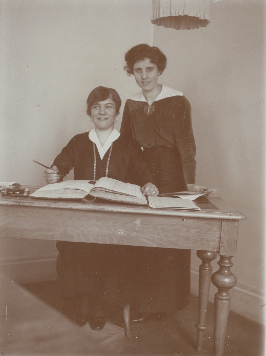 Skrivbiträdena fröken Olai och Angberg på Postsparbanken omkring 1920.