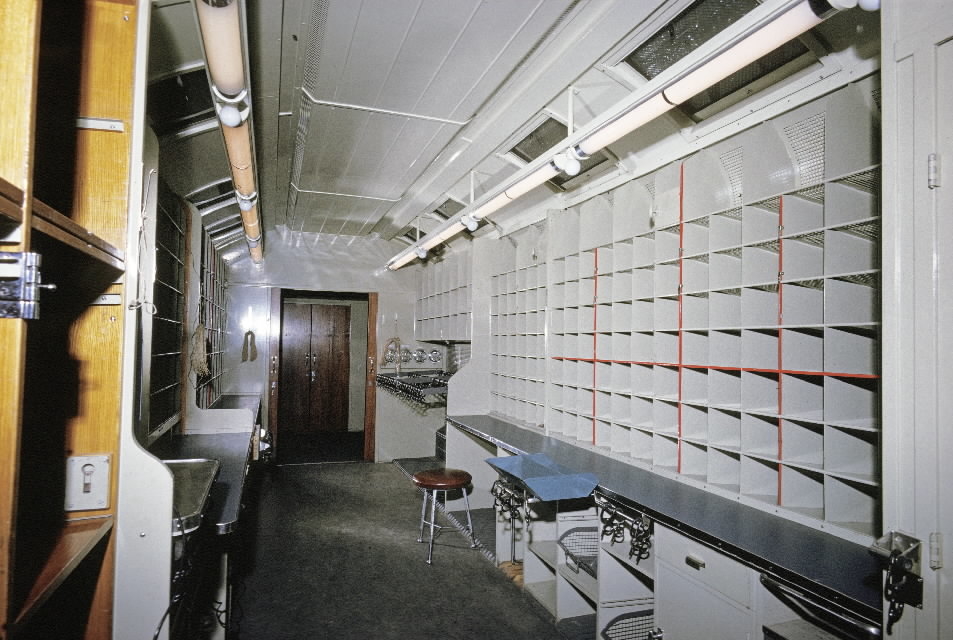 Interiör av ny modell av järnvägspostvagn, uppställd vid postkontoret Stockholm, den 7 november 1963