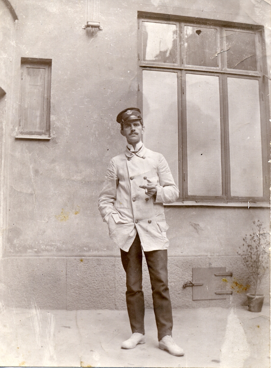 Från baksida: "Fredrik Ericsson började (i seklets början) som postbetjänt som lådtömmare (efter häst) fortsatte som brevbärare (i sommaruniform på fotot) sedan som brevbärarförman och postsorterare på Stockhom 1 - ankommande, till sin pensionering. "