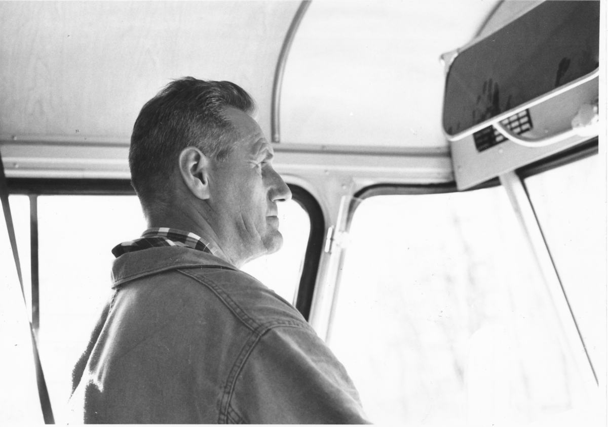 Postdiligensförare Erik Rönnbäck i postbuss. Bilden är troligen tagen sommaren 1970.