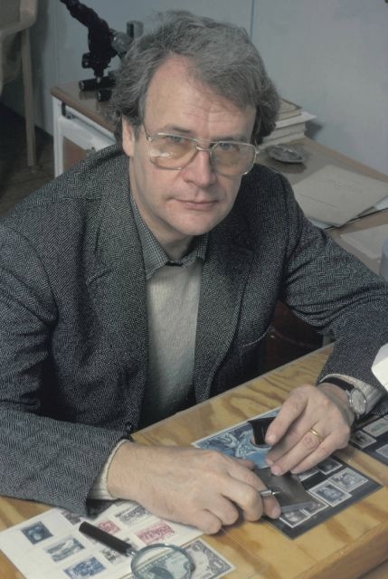 med en fri-märksgravyr. I hans arbetsrum på Postens Frimärksavdelning