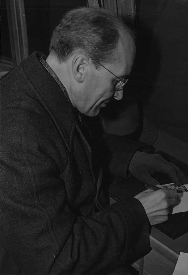 byggda fältpostbussen och skriver kort.