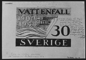 Förslagsritningar - ej antagna - till frimärket Vattenfall 50 år, utgivet 20/1 1959. Kraftstationen vid Nämforsen i Ångermanland. Konstnär: Tor Hörlin. Förslag. Fotokopia.