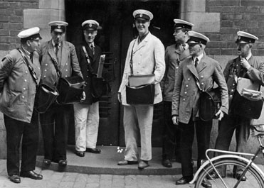 Värdebrevbärare samlade utanför postkontoret Stockholm 1 år 1942. I mitten (i vit uniform) K Albin Ward. (Minnesinsamlingen - 286).