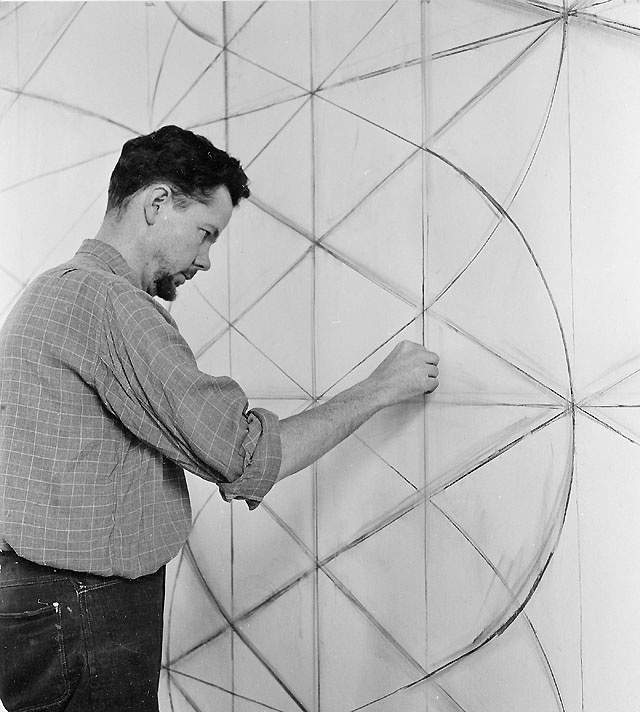 Blivande U.P.U.-rummet på 2 trappor (f.d. rum 4). Konstnären Lennart Rodhe skisserar upp sin väggmålning "Paket på löpande band", vars original tillhör postkontoret i Östersund. Foto 2 juni 1955.