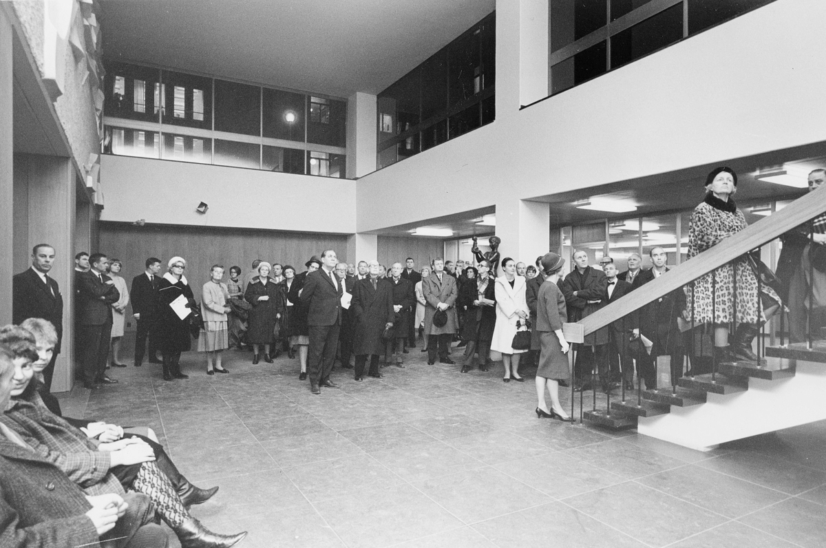 Åhörare i entréhallen och trappan till det övre planet lyssnar till postbankschefens invigningstal.