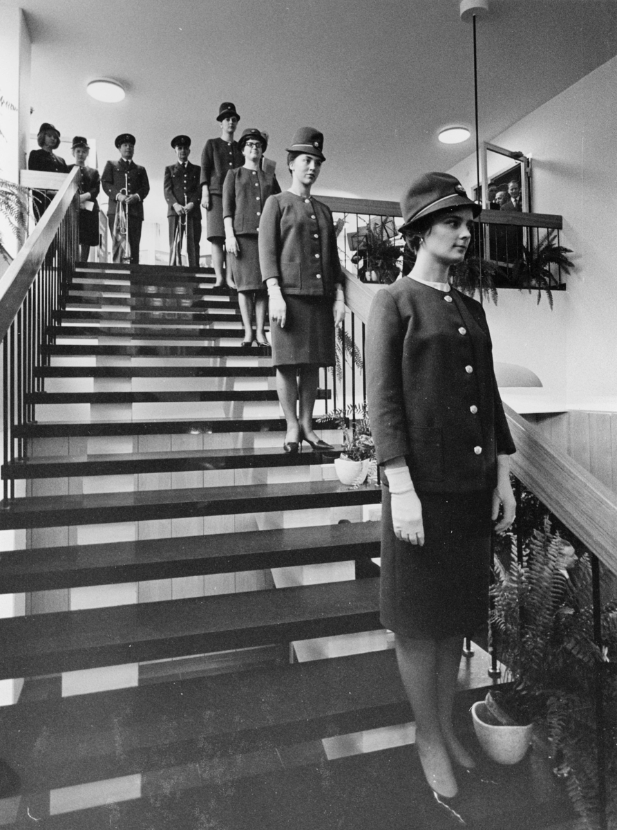 I entréhallens trappa paraderar postbankens värdinnor. Iréne Kvarzell, närmast, och Elsie Steen.