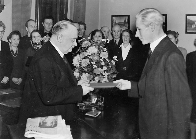 Titel: Sekreterare E E Johansson överlämnar en adress.