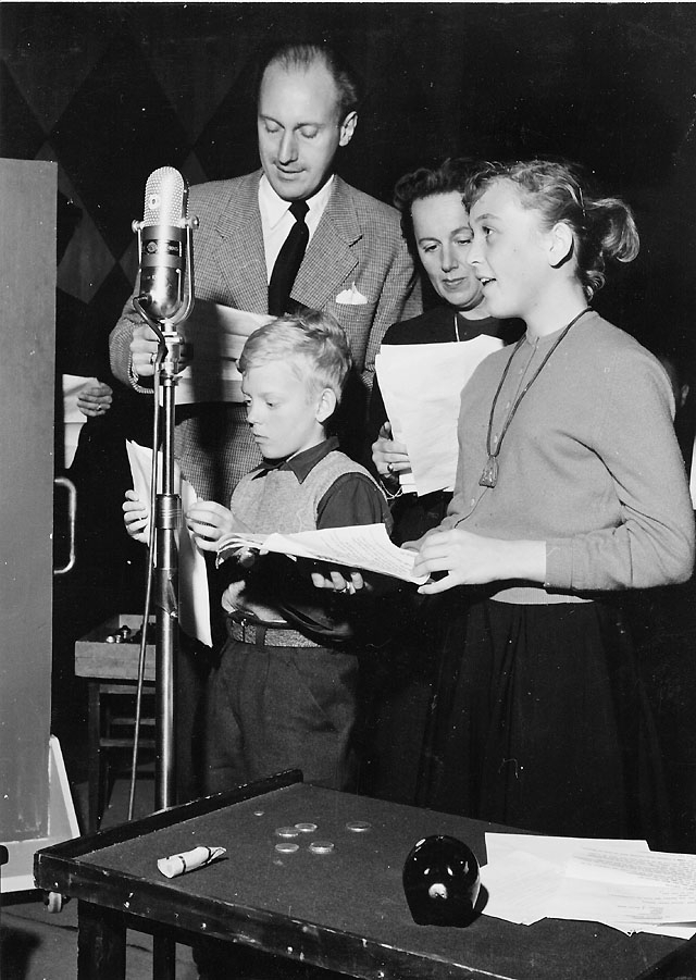 Skådespelarna Gösta Prüzelius och Britta Brunius samt två barn