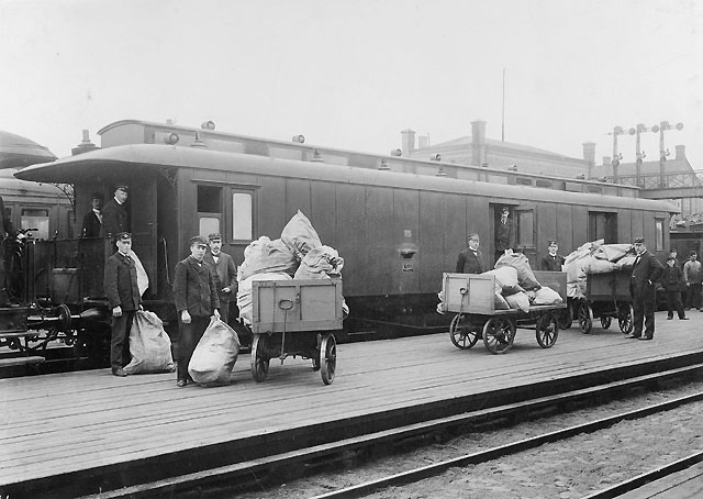 Titel: Urlastning av post på Malmö järnvägsstation.