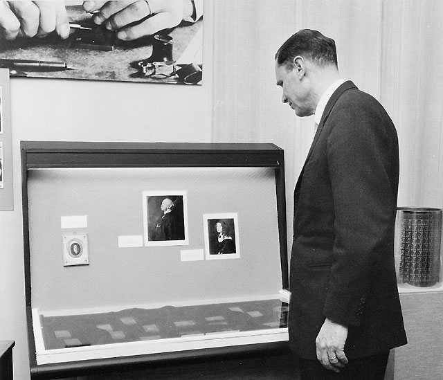 Generaldirektör Erik Swartling studerar stålgravyrer utförda av