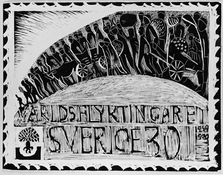 Frimärksförlaga till frimärket "Världsflyktingåret 1959 - 1960", utgivet 7/4 1960. Förslagsteckningar utförda av konstnär Kerstin Abram-Nilsson. Valör 30 öre.