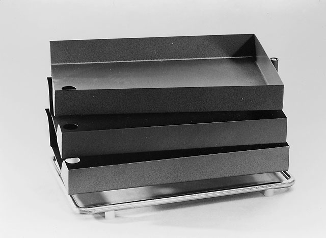 Brevkorgställ, av plåt, grön, med tre korgar. Art.nr 505.10