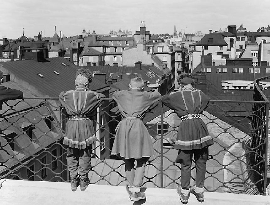 Tre av barnen tittar ut över staden (norrut) från Girots takterrass.