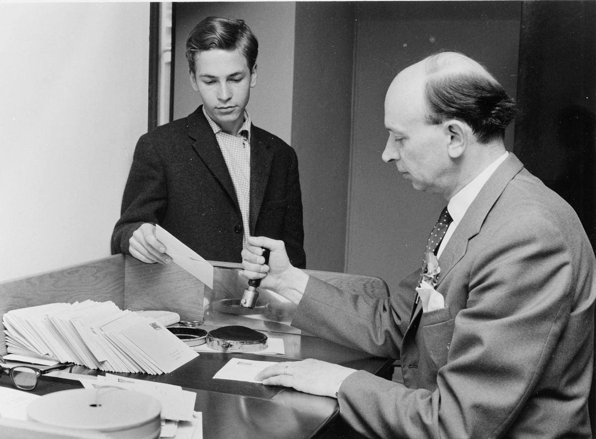 Nilsson, bankavdelningen, under överinseende av en yngre filatelist.