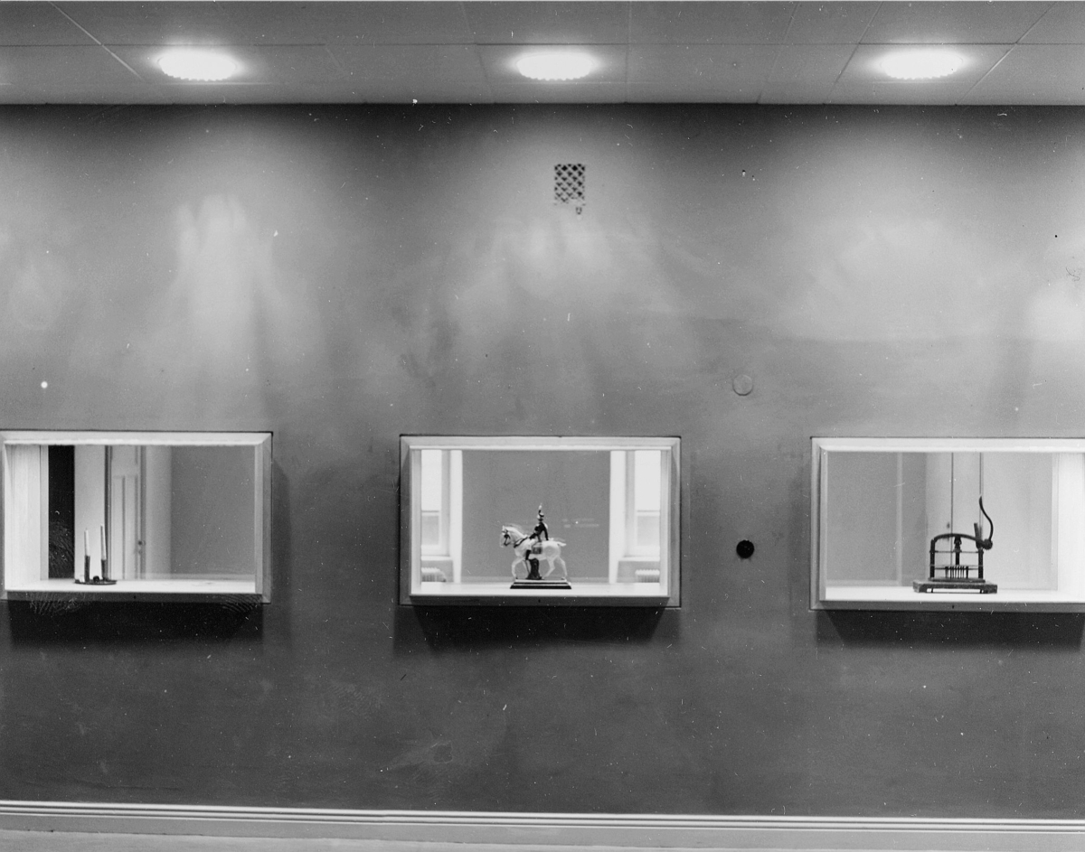 Fönster mot trapphallen, med utställningsföremål.