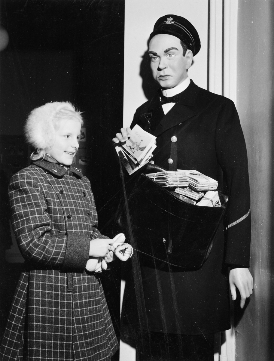 Brevbärarförman från 1900-talets början med väska och julkort.