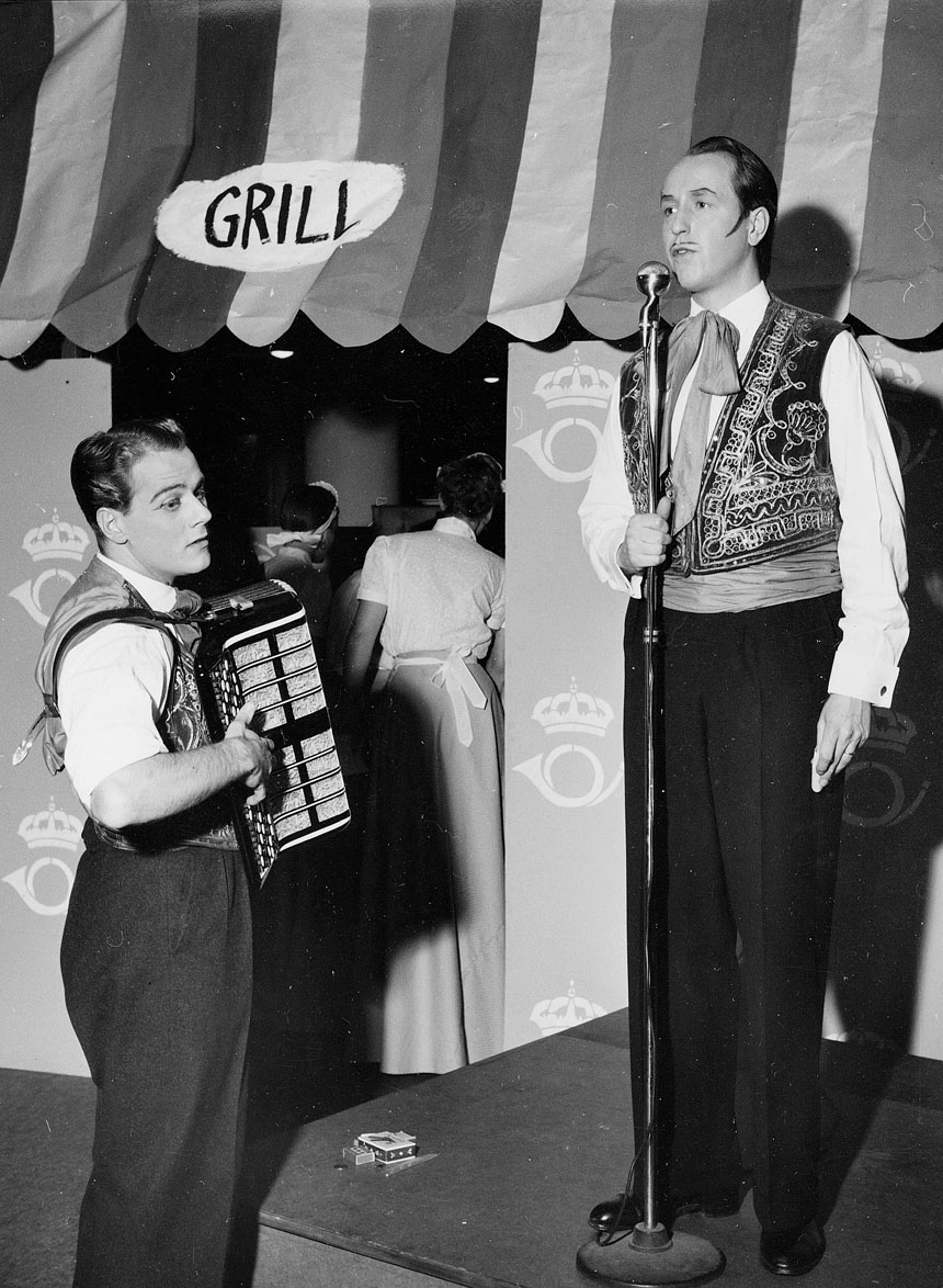 Värdshuset "Den gyldene flygeln". Cabaret med sång och dans i Postgirots lunchrum Klara Norra Kyrkogata, Stockholm, den 28 november 1953.