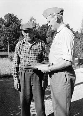 Postkunden Gustavsson, Bro gård, Skeppsdal får dagens post av lantbrevbärare Erik Johansson.