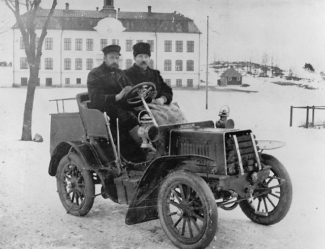 Fordonet "Star", förmodligen Sveriges första postbil, trafikerade sträckan Trosa-Järna innan stambanan var utbyggd över Vagnhärad. Fotot taget år 1906, då bilen undergick besiktning, framför Östra skolan i Nyköping.