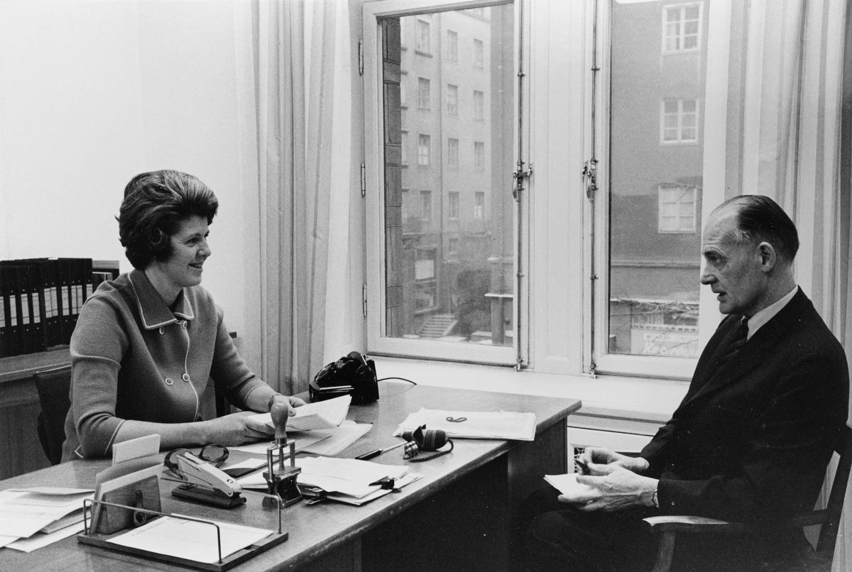 Fks Ulla Malmén, som är chef för katalogredaktionen, berättar här för bd Olof Stavre att postnummer förs in i den nya katalogen. Genom fönstret syns hörnhuset Birger Jarlsgatan - Eriksbergsgatan.