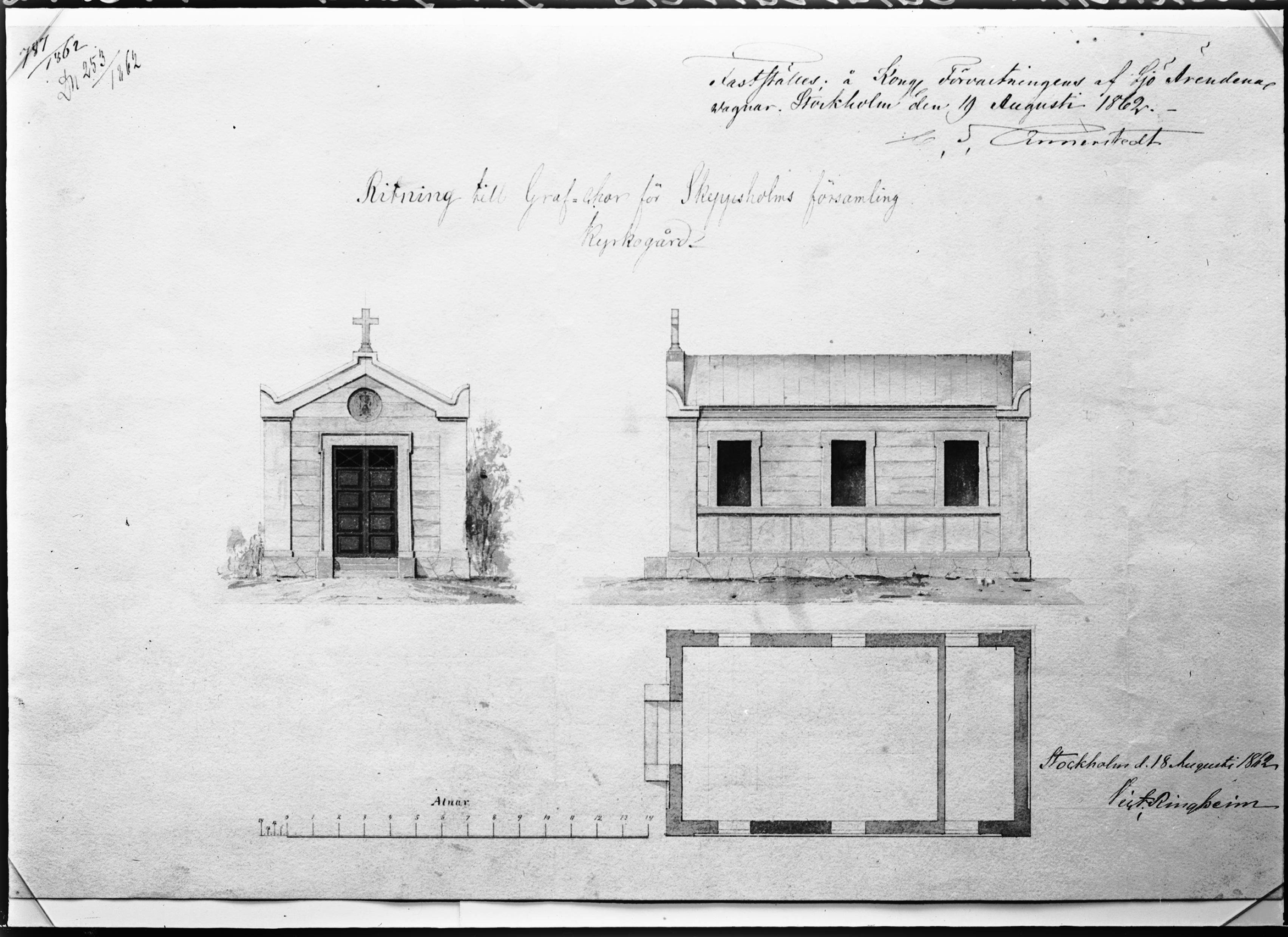 Gravkapell, plan- och fasadritning, foto efter ritning av arkitekt Victor Ringheim 1862.