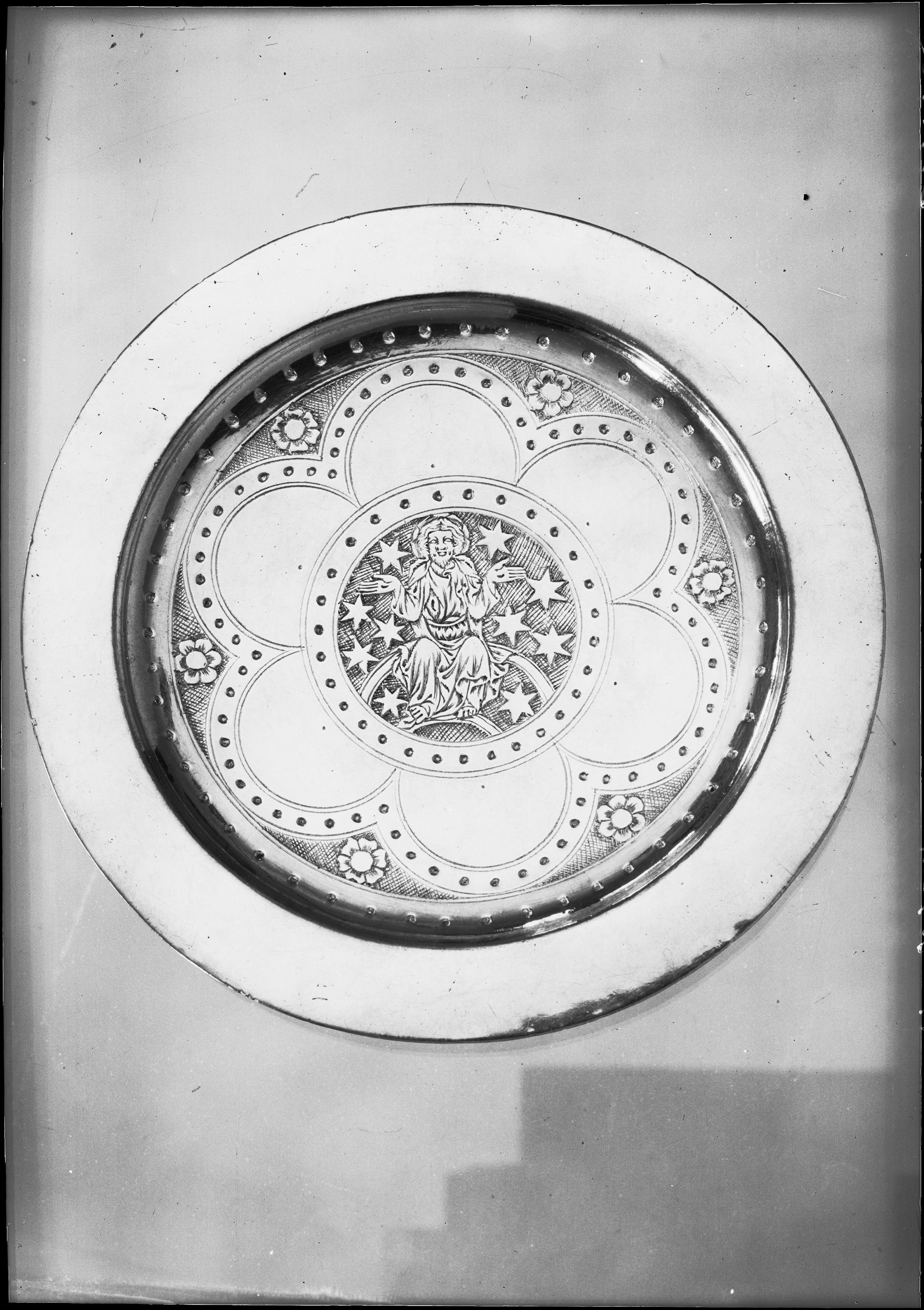 Patén, förgyllt silver, i mitten Kristus på regnbågen omgiven av stjärnor. 1300-talet.