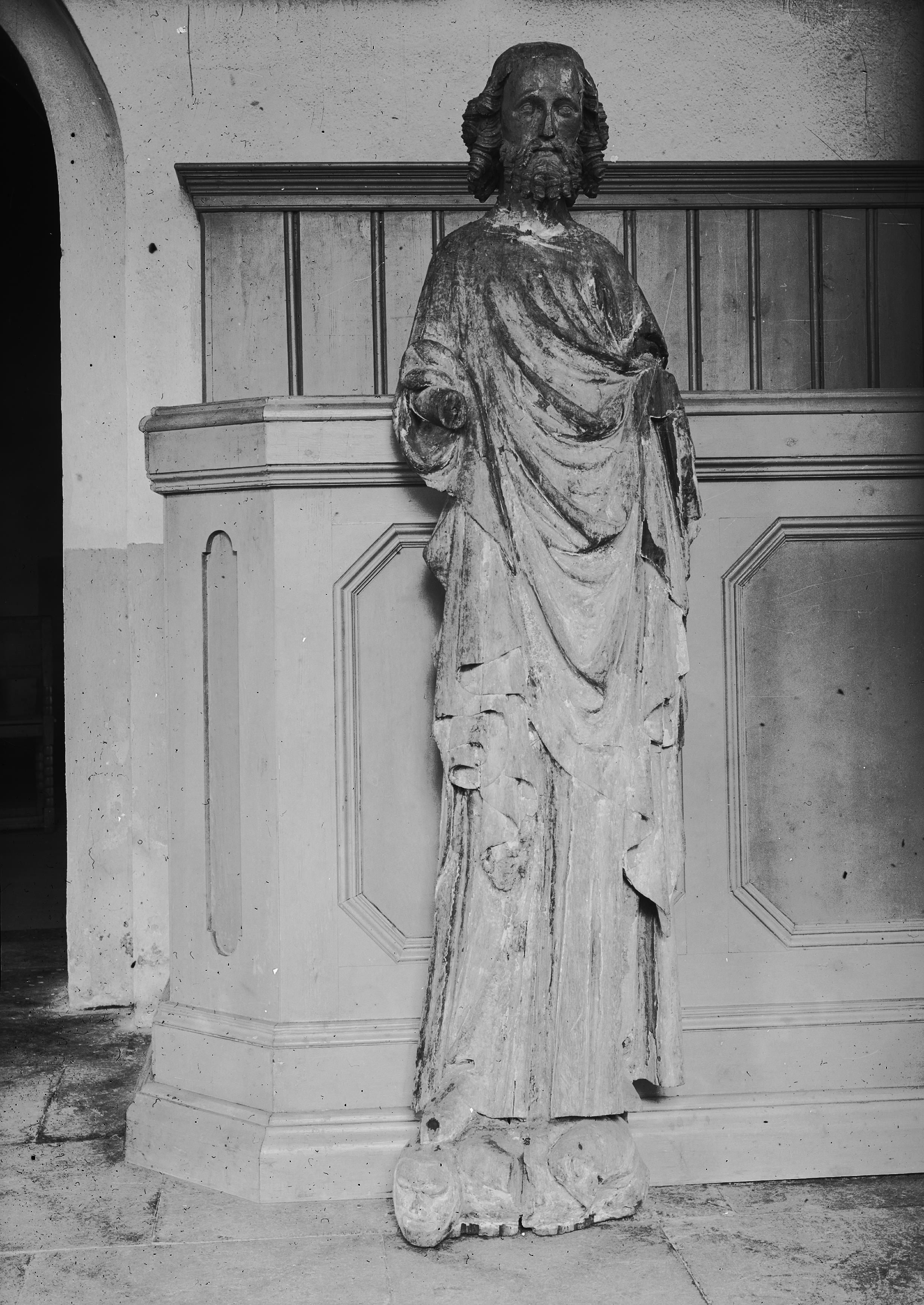 En skulptur av S:t Olof. Bild av ek: står på skalle. Bevarade rester av polykromin visar att manteln varit i guld med brokadmönster. Huvudet skulpterat runtom, ryggen urhålkad. Svenskt-franskt arbete från 1300-talets början (snabbinv). Saknar armar.