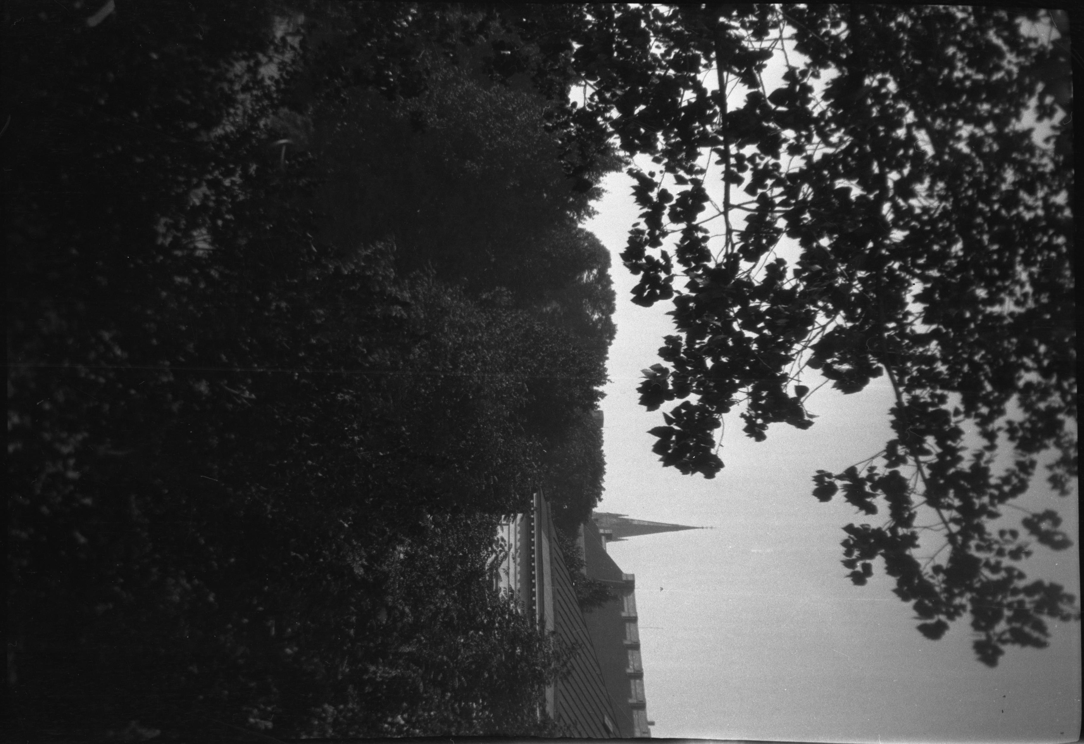 Utsikt från Villagatan mot Karlavägen skymd av lövträd