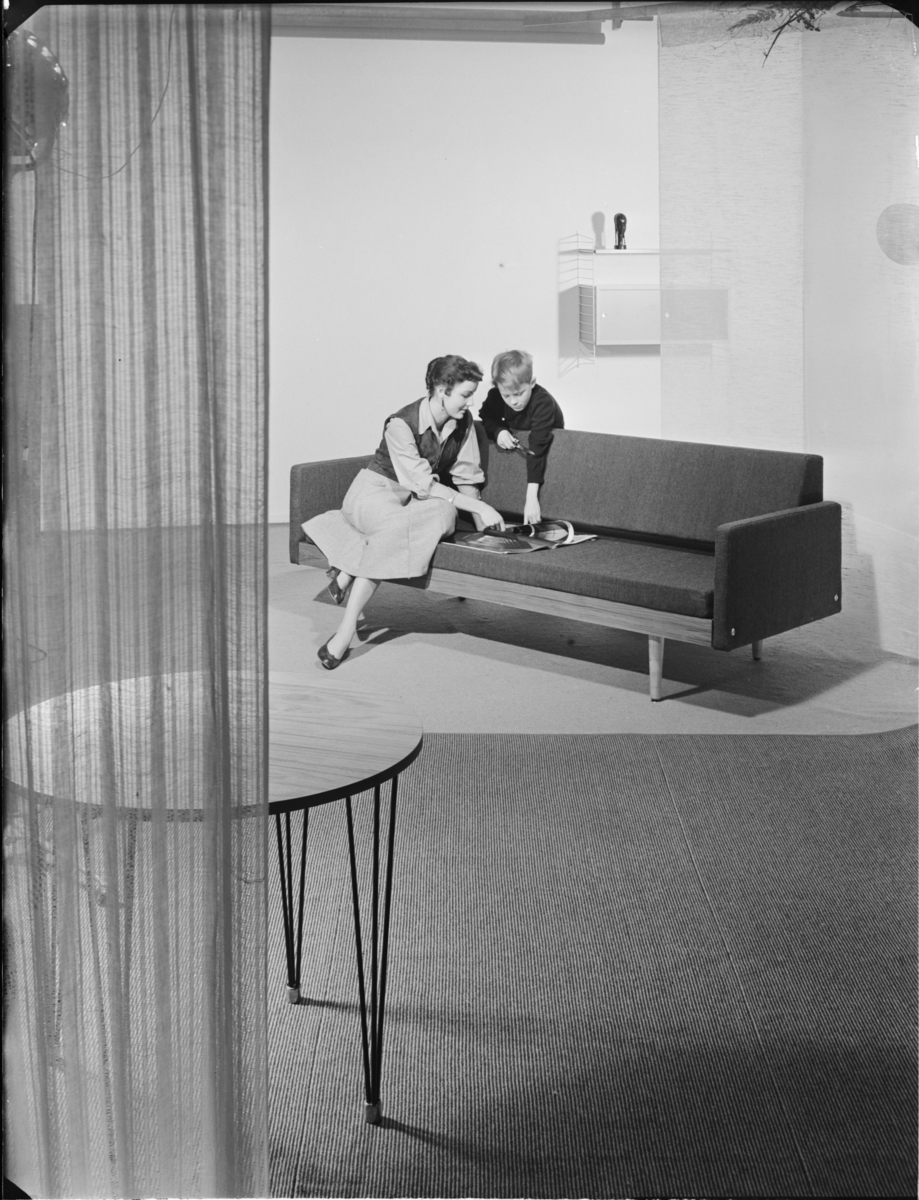 Titel: OMSLAG STRING I BILDEN, BÄDDSOFFA MED ARRANGEMANG I ATELJEN