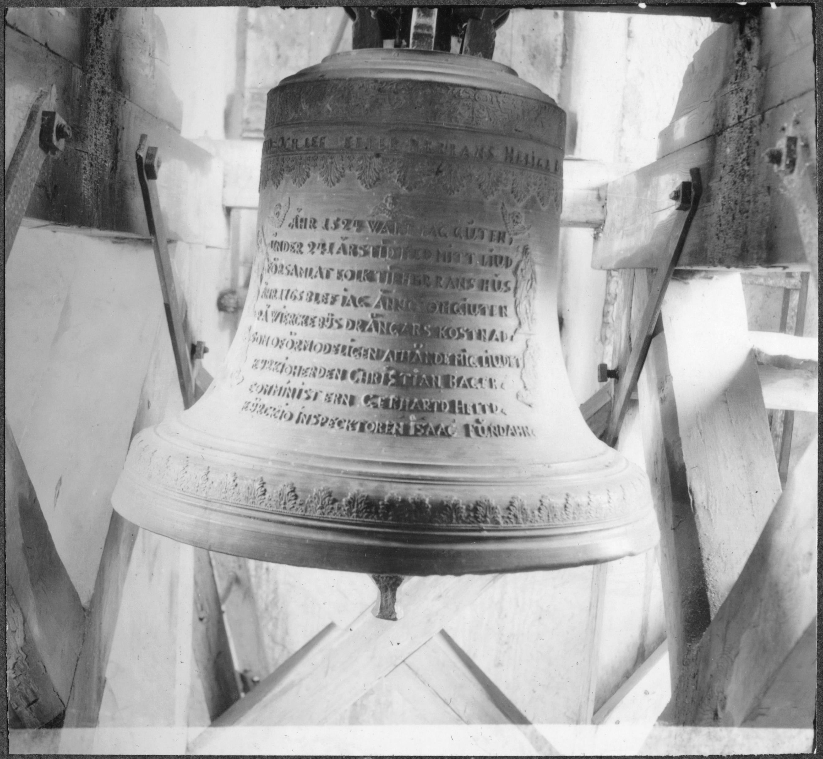 Klocka av malm. Från den gamla 1100-talskyrkan, omgjuten 1765. Med inskription " Åhr 1524 wart jag gjuten...".
