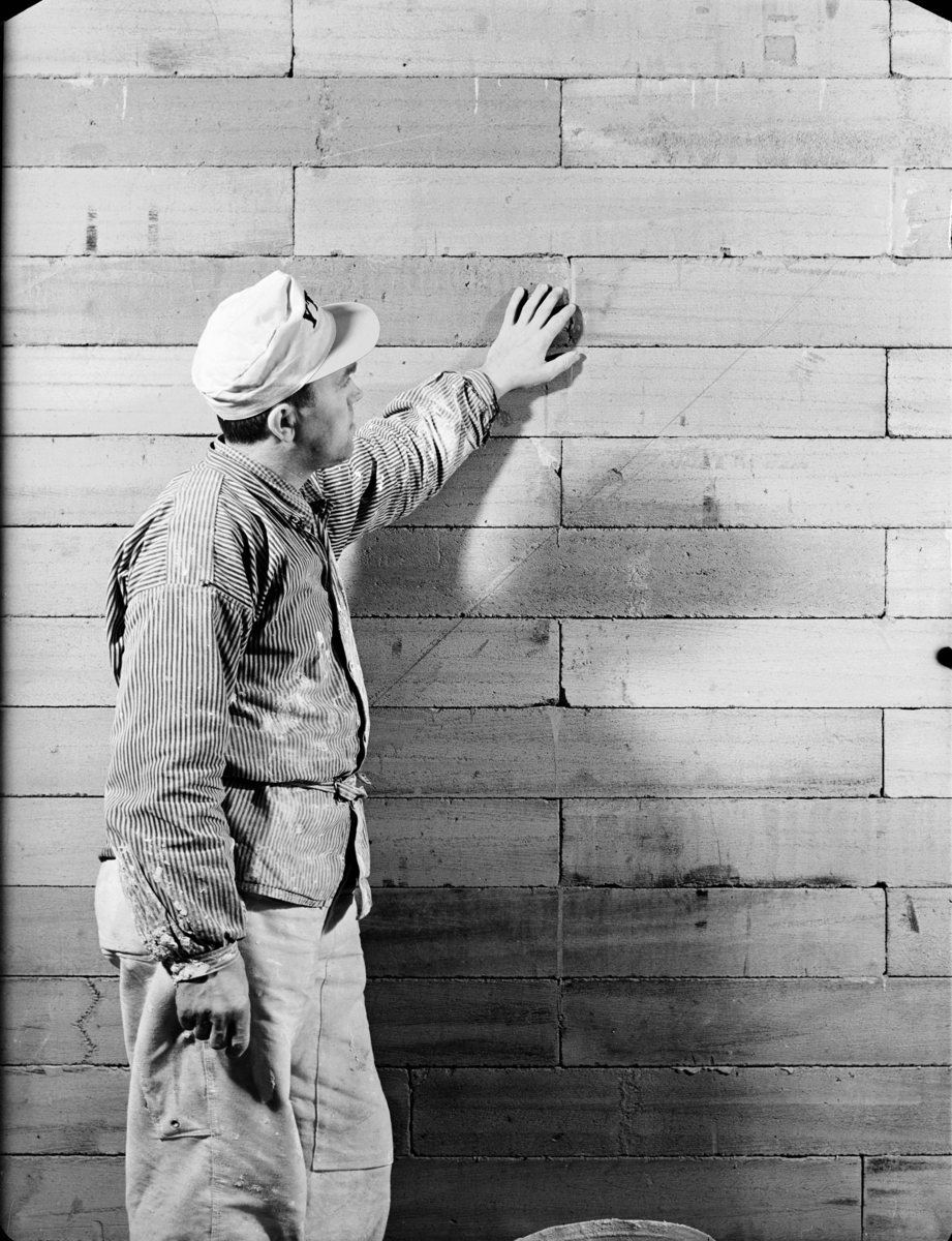 Titel: Yxhults Försäljnings AB, stavvägg kvarteret Gummibandet, Vällingby, Farsta. Arbetsbilder med Miran och Miramatt