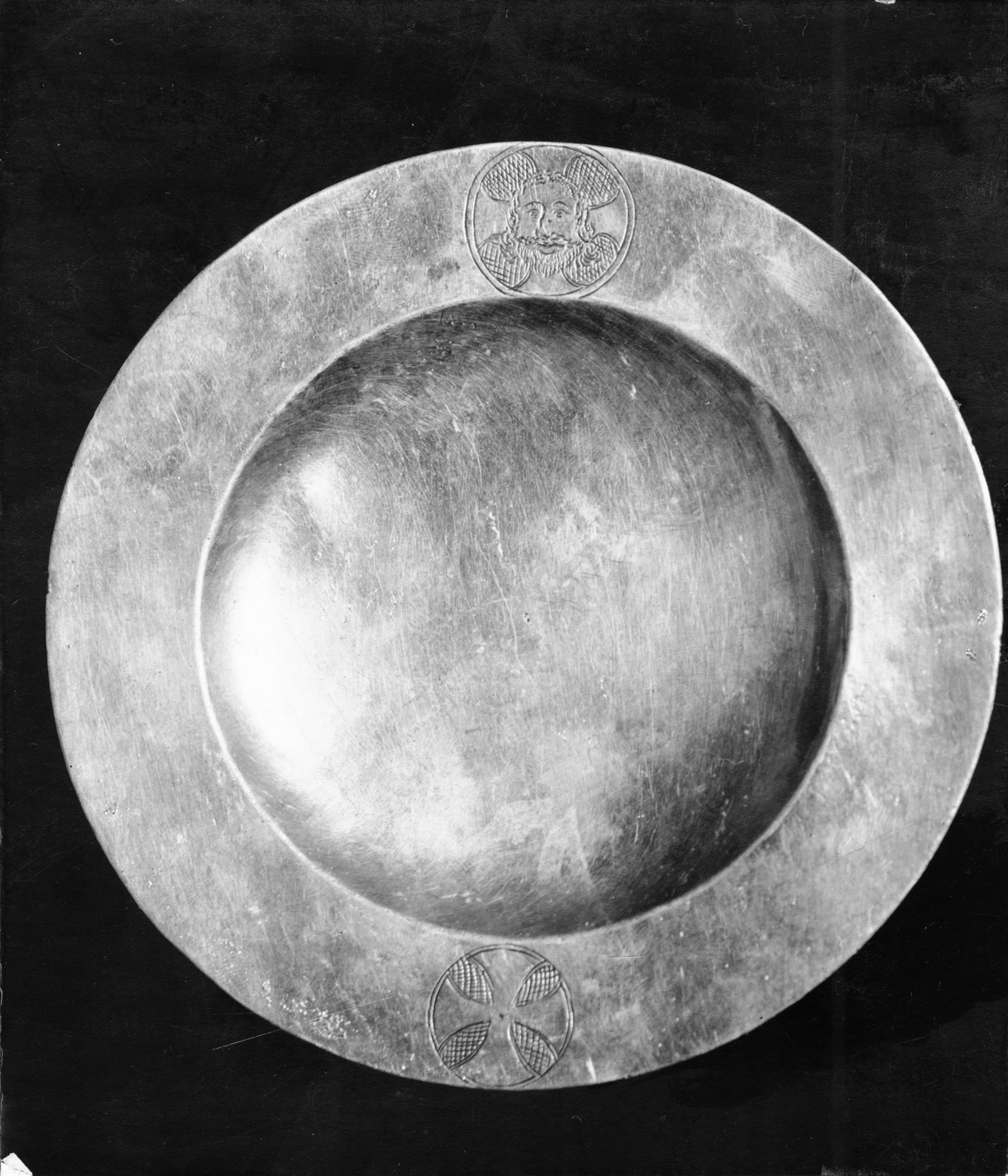 Patén, dekor på brämet av hjulkors och Kristus-huvud i korsgloria.