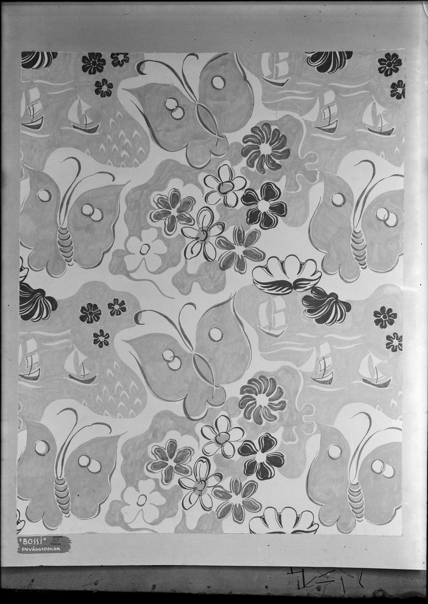 Tapet, "Bossi III, En väggdekor". Blommor, fjärilar och segelbåtar.