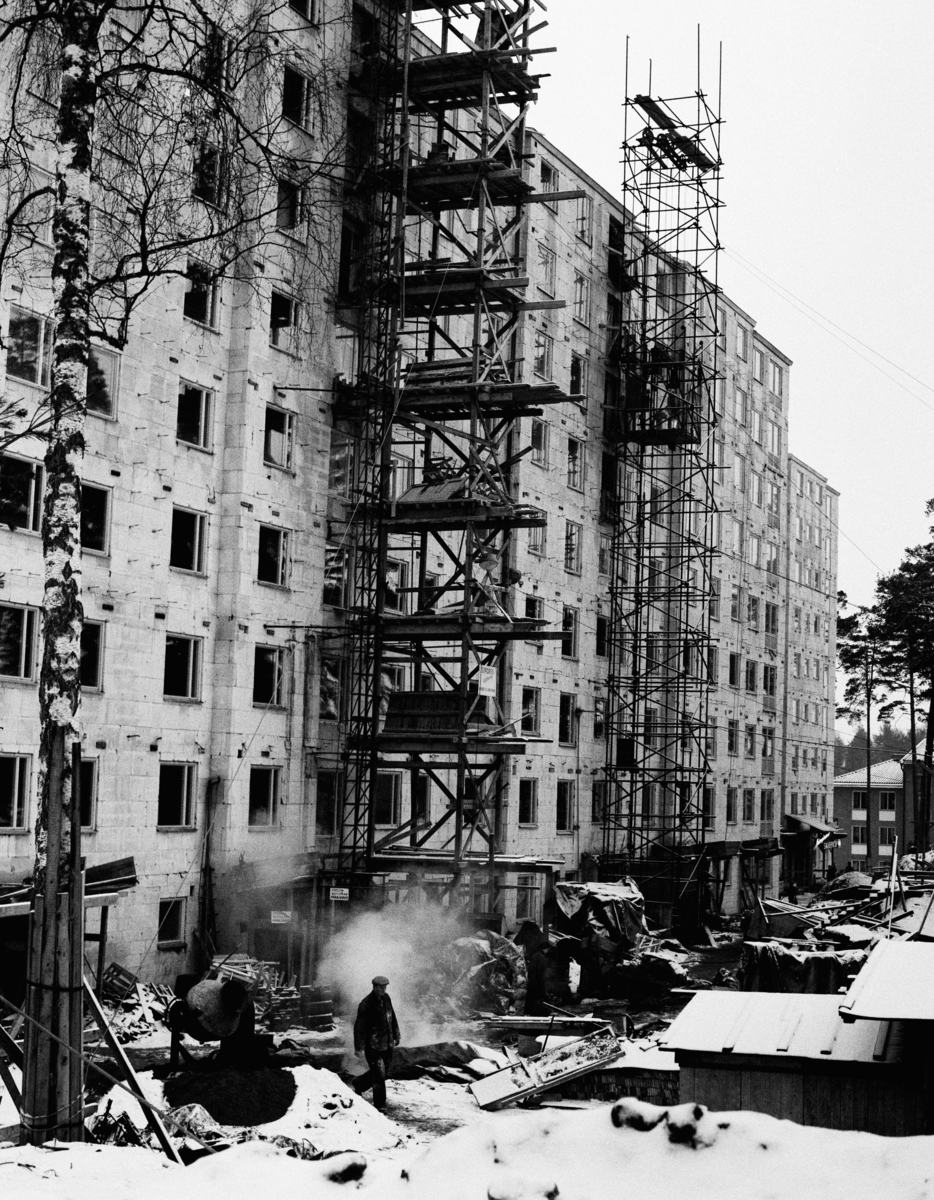 Exteriör, flervåningshus med byggnadsställningar i vinterlandskap.