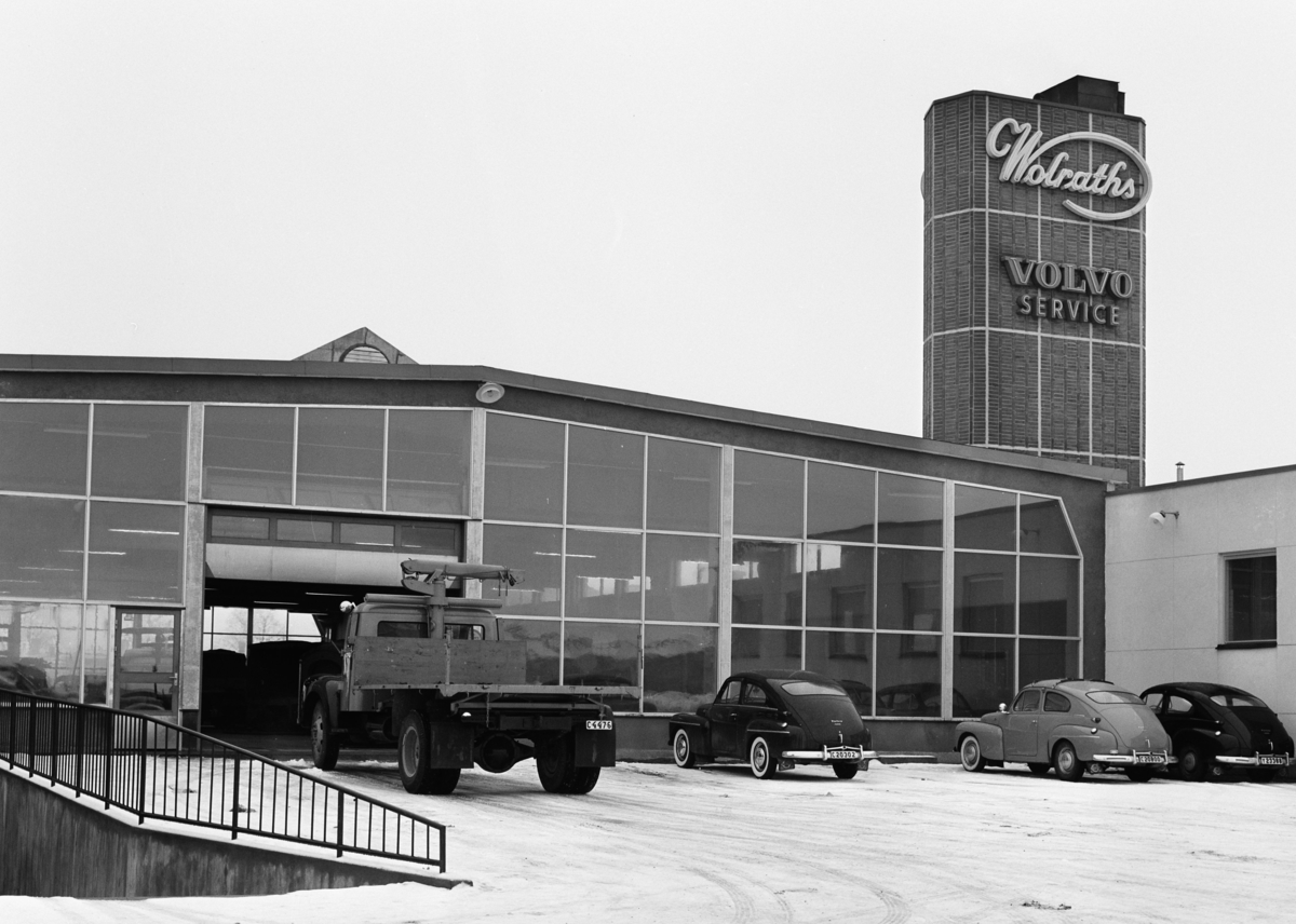 Exteriör, lastbil på väg in genom öppen skjutport i uppglasad fasad. Skylt med Wolraths Volvo Service