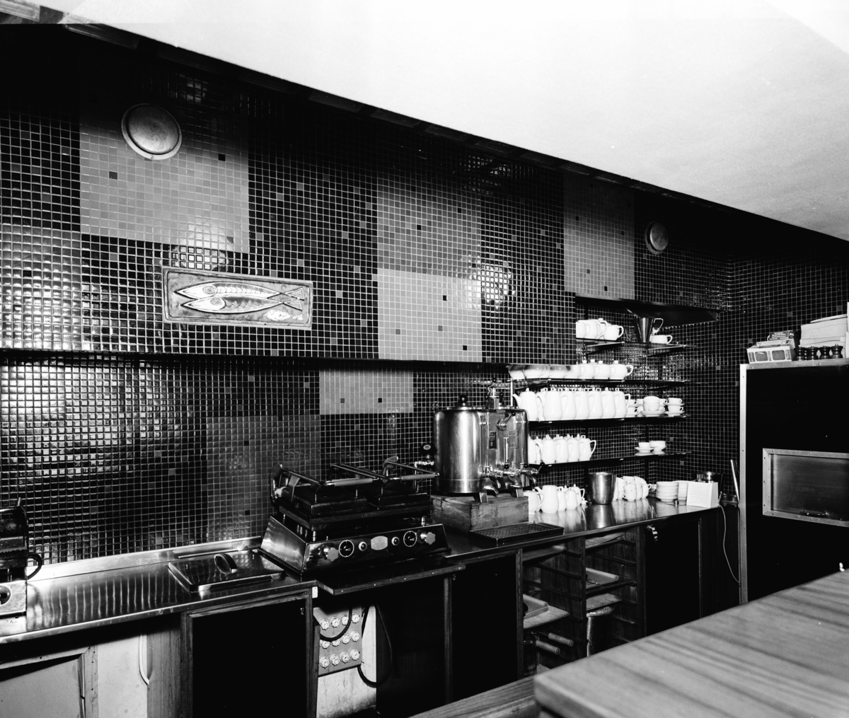 Interiör, detalj av barkök med mosaikbeklädd vägg bakom disk.