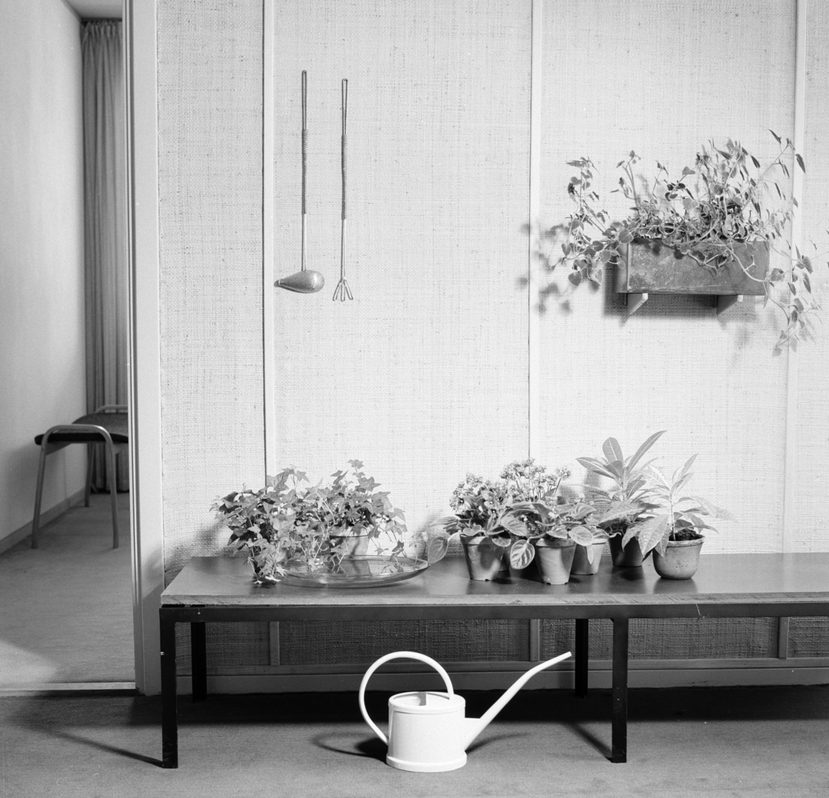 Interiör, blombord med vattenkanna. Från Hem i Sverige-husets finrum på Helsingborgsutställningen.