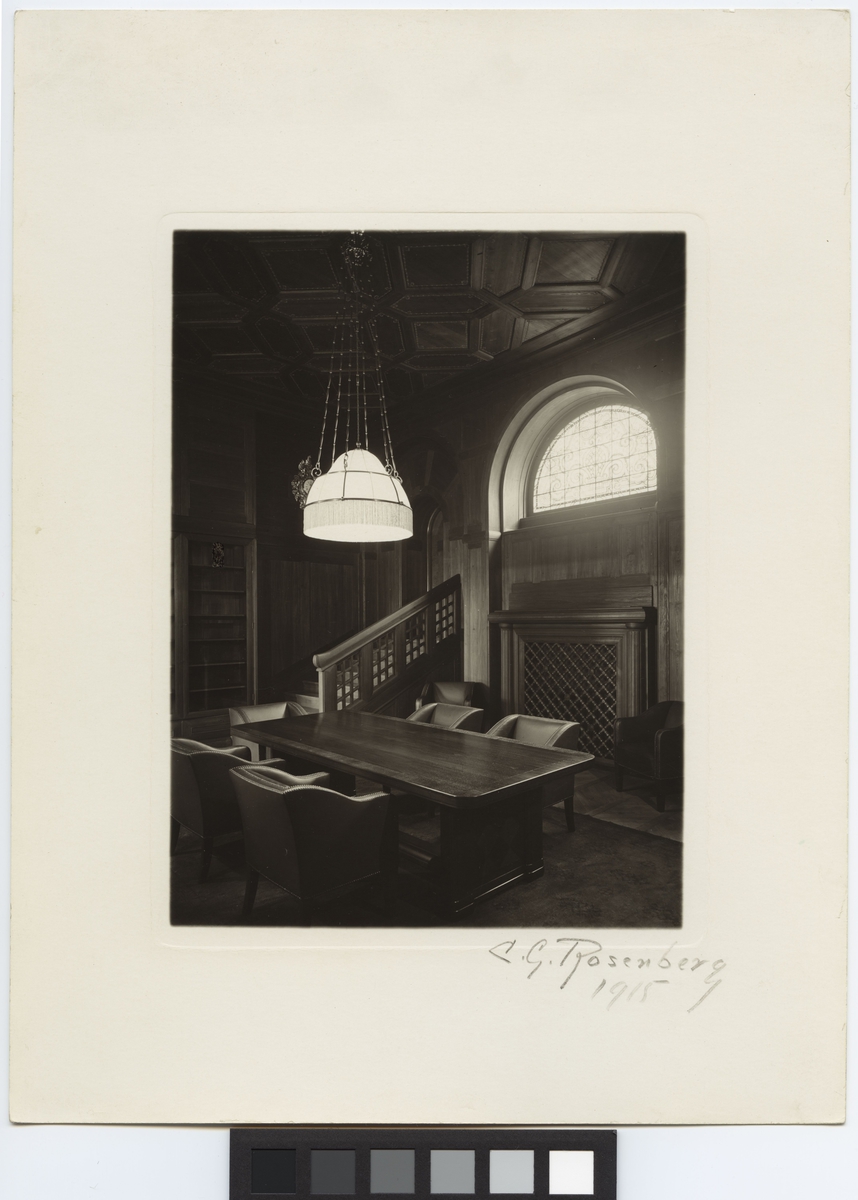 Interiör, rum med bord och stolar samt belysningsarmatur i tak.