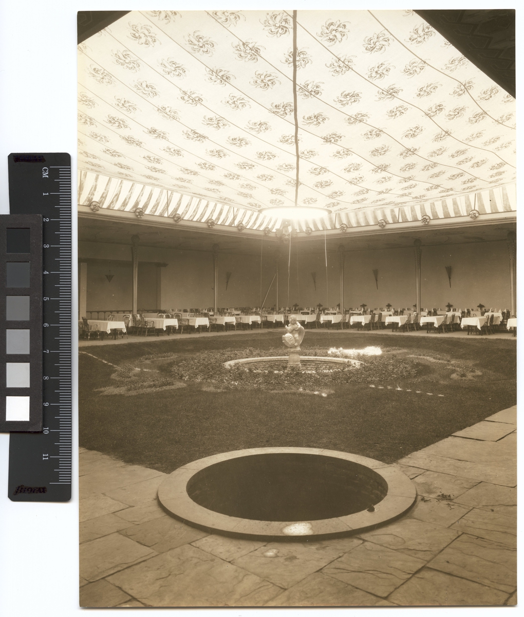 Huvudrestaurangen, gården. Brunn i förgrunden samt liten bassäng med skulptur i och blomsterrabatter omkring.