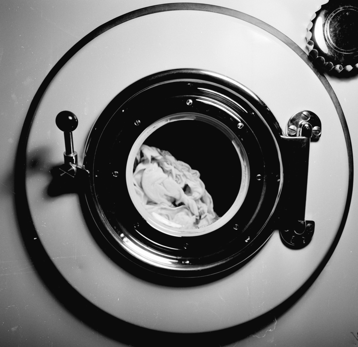 Interiör, tvättstuga i Stureby. Detalj av tvättmaskin