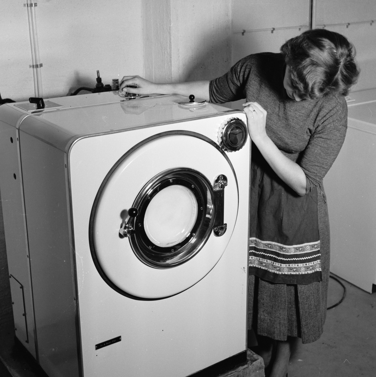 Interiör, tvättstuga i Stureby. Kvinna vid tvättmaskin