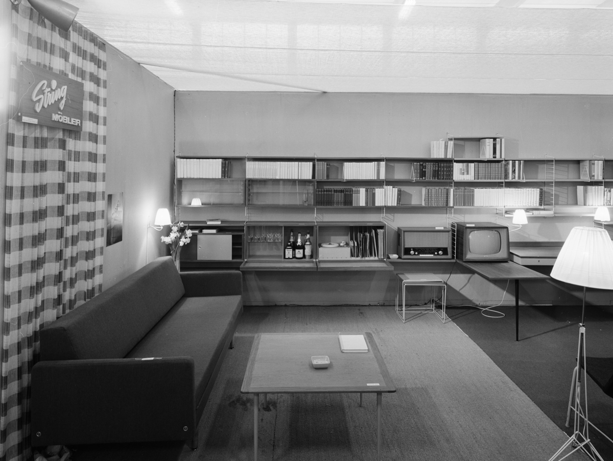 Titel: Interiör på möbelmässan i Sankt Erikshallen. Stringhylla.