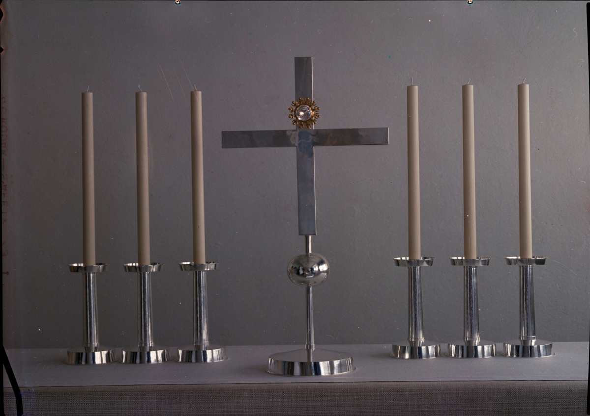 Altarkors med bergkristall och altarljusstakar i silver, Adolf Fredriks kyrka, Stockholm.
