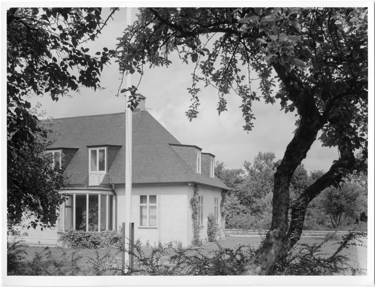 Exteriör dagtid. Del av husets långsida samt gavel mot trädgården, i förgrunden gräsmatta, flaggstång och träd.