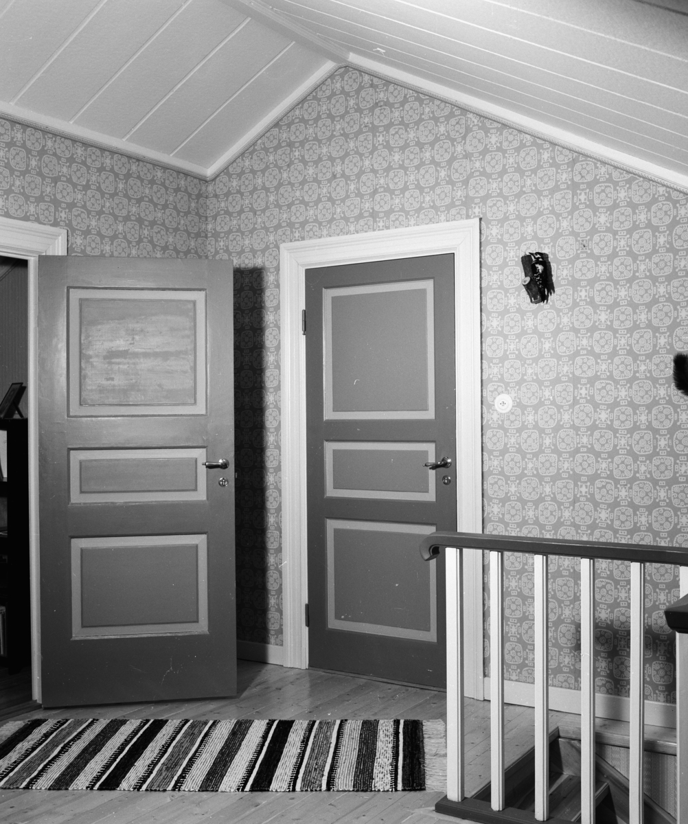 Interiör, övre planets trapphall, målade spegeldörrar och på golvet trasmatta.