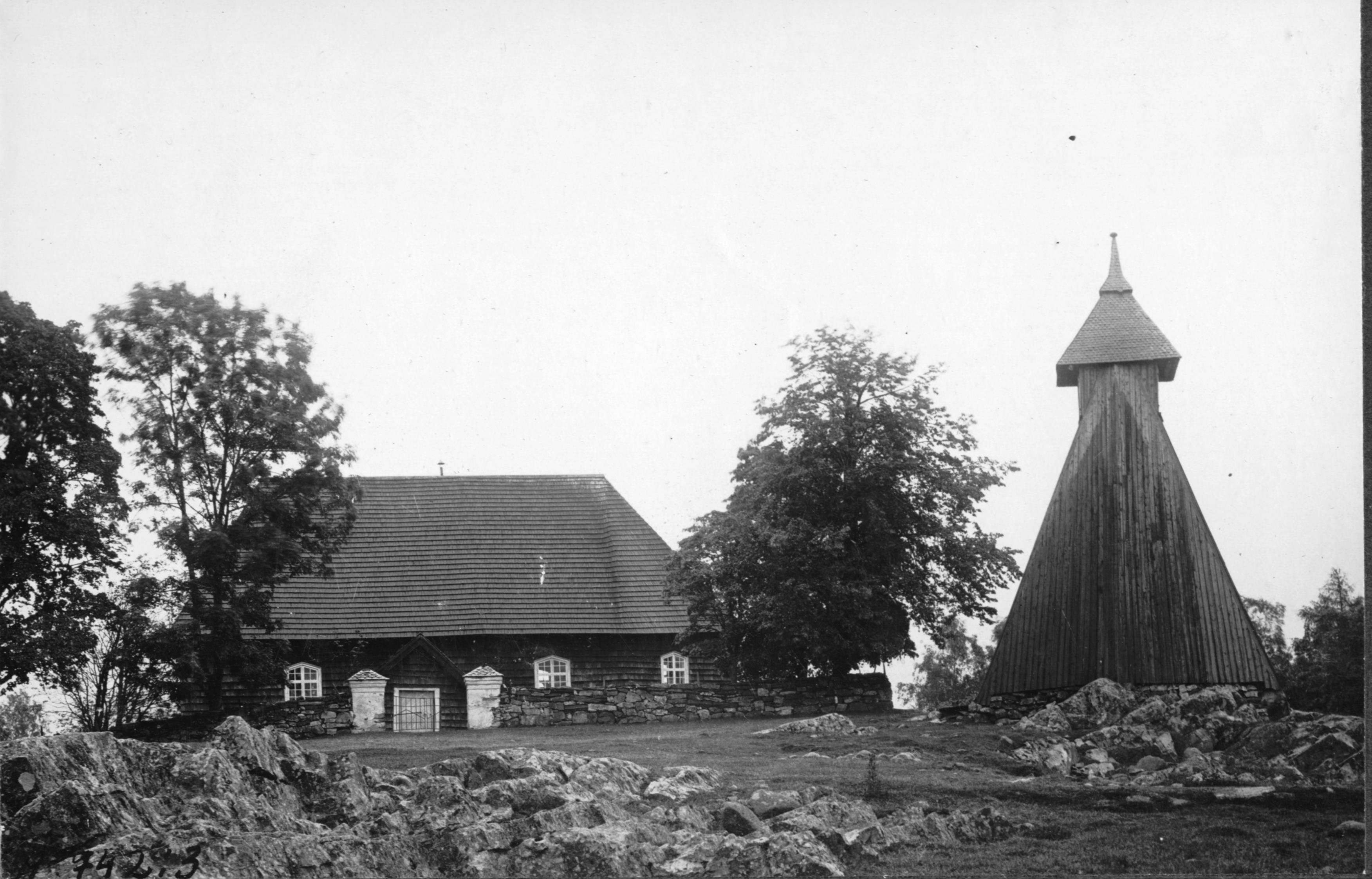Kyrkan och klockstapeln från söder.