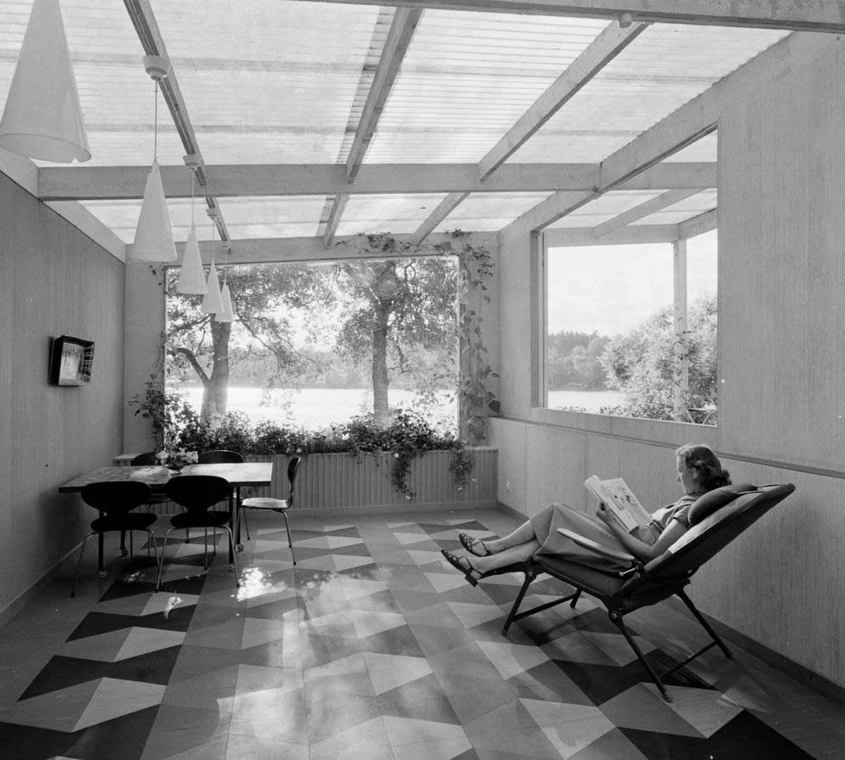 Rum med plasttak och mönstrat golv. Läsande kvinna i vilstol