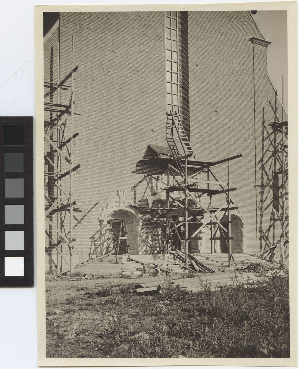 Titel: Högalidskyrkan Exteriör under byggprocessen. Västportalen med byggställningar utmed fasadliv.